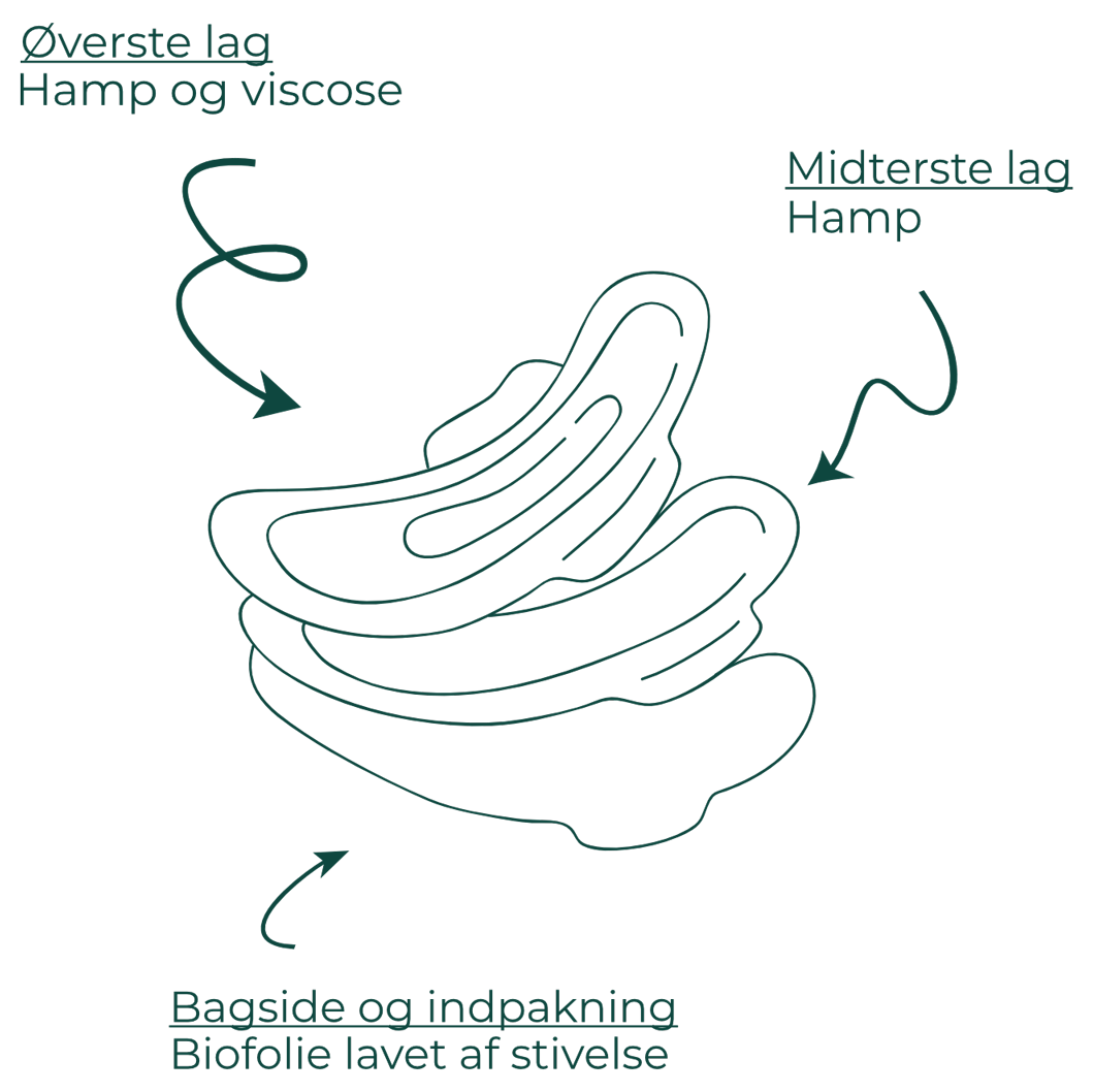 Da hamp er en meget grov plante og svær at blødgøre, så har vi mikset det øverste lag med viskose for at gøre det blødt og lækkert. Vores mål er at lave dette lag i 100% hamp i fremtiden. Funktionen for det øverste lag er at transportere væsken til bindets midterste lag.